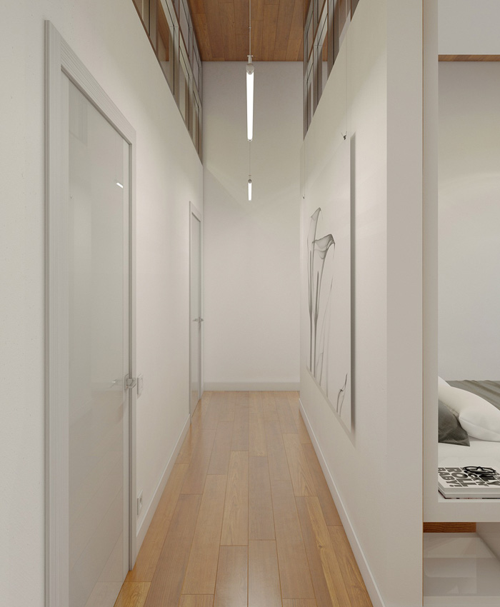 This apartment, from designer Anton Medvedev, manages to quite literally rise above this atmosphere. The stunning interior is perfectly minimal with calming materials, smooth, clean lines, and a color palette that is so neutral you can almost hear the silence of the apartment. The living room and kitchen are open to one another and both utilize a white, gray, and natural wood look. The slick hardwood floors are certainly notable, serving to unify each part of the apartment. The endtables that flank the soft sofa are hollow, creating simple but elegant lines. This design extends to the kitchen where barstools mimic the same shape. In the dining room, natural light floods over the beautiful wood table, bouncing off the smooth white walls, for an ethereal and appetizing feeling. The modern windowseat consists of a wood slat bench with two simple trees, bringing a bit of nature up to the high floor. In the bedroom, white and gray are still pervasive. The low platform bed is flanked on either side with creative end tables. These surfaces extend from the ceiling to the floor, drawing the eye up and helping to elevate the apartment's ceilings even further.